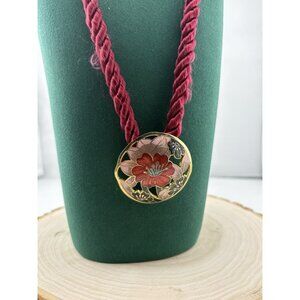 Vtg Cloisonné Floral Pendant Necklace Red Enamel Flower W/Gold Burgundy Cord