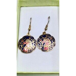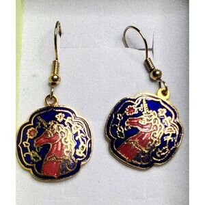 Vtg Cloisonne Enamel Unicorn Dangle Earrings Gold Tone Red Blue Boho Fantasy