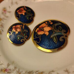 Vtg Cloisonne Enameled Round Floral Butterfly Brooch And Earring Set Navy