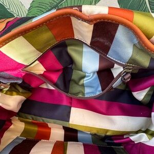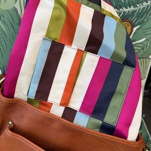 Signature Legacy stripe lining: The interior is lined with a smooth sateen or satin-like fabric that displays the multicolor Legacy stripe pattern. This lining is a key indicator of its 65th-anniversary limited edition status.
