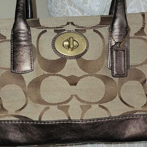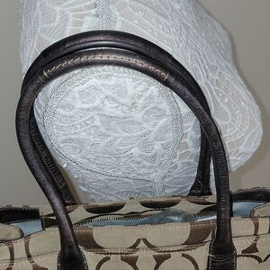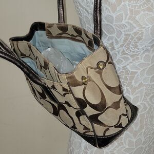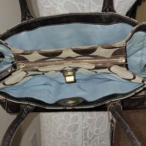 Vintage Coach Signature Shoulder Tote Purse with Pockets, Pouches, Twist Lock, Zipper Closure, and Beautiful Blue Interior