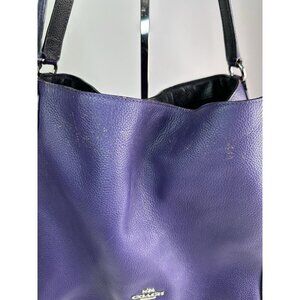 The Vtg Coach Turnlock Edie Dark Purple Pebble Leather Shoulder Bag is a stylish and versatile accessory for women. This large shoulder bag features a pebbled exterior in a rich dark purple color, with silver hardware accents. The bag has a zip and turn lock closure, double purple leather handles, and a lined interior with inner pockets and dividers. It is perfect for travel, casual outings, workwear, or business meetings, adding a touch of sophistication to any outfit. The bag also includes a charm, original dust bag, and bottom studs for added durability.