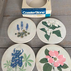 Vtg CoasterStone Sandstone Flower Coasters Set of 4 in Box Floral 4.25" diameter