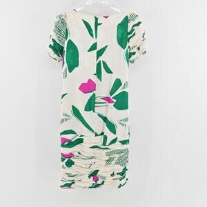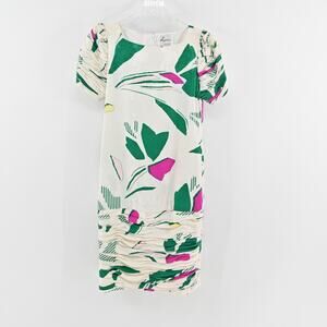 Vtg Cocktail Dress Sz L White Floral Silk Puff Sleeve Ruched Square JAYNA 80s