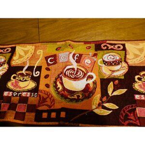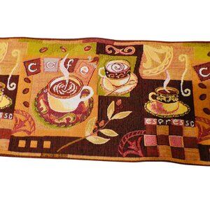 Vtg Coffee-Themed Tapestry Table Runner 13x54" Espresso Cafe Brown/Yellow/Red
