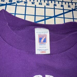 This vintage Colorado Rockies T-Shirt in size Large features a logo graphic on the front, representing the rocky mountain region. Made of cotton with a crew neck and short sleeves, this purple shirt is machine washable and perfect for all seasons.