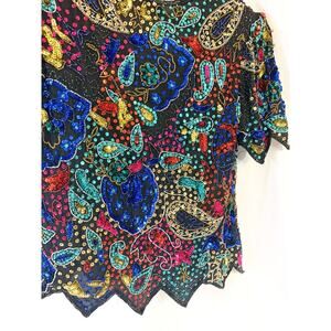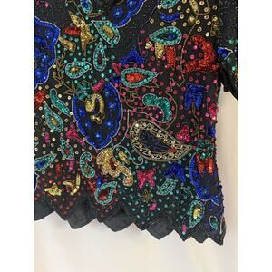 Vtg Colorful Beaded Sequin Laurence Kazar Silk Top Blouse Holiday Paisley