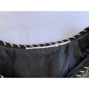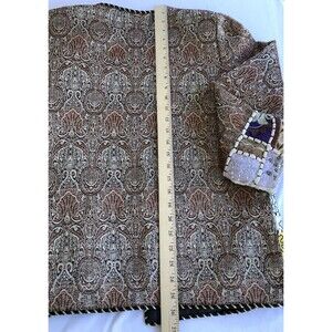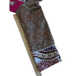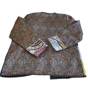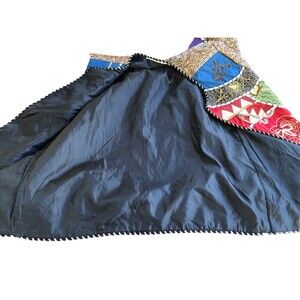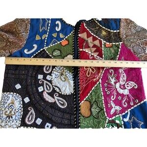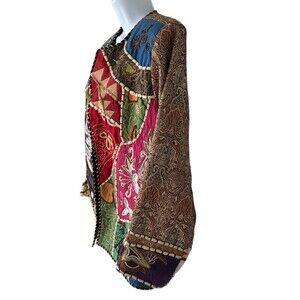 This vintage jacket is a colorful patchwork with a button front. It is unbranded, but the tag has been removed. The jacket is made of a blend of silk and cotton fabrics and is from the 1980s. The size is L/XL, and the chest size can be seen in the photos. The jacket has a unique style that is perfect for anyone looking for a statement piece. The shoulder to hem length can also be seen in the photos. This jacket is an original piece and is perfect for anyone who loves vintage clothing.