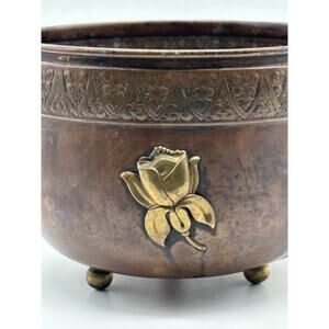Vtg Copper Planter Cache Pot Houseplant Embossed Brass Flowers Footed Patina