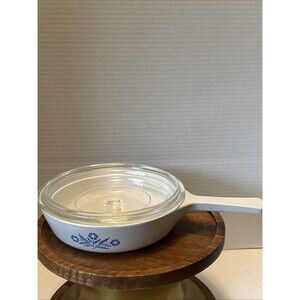 Blue corn flower, 6.5 inch Corning Ware skillet WITH lid in great condition. I found one chip in the lid which I don't think will alter the usability. Please see photos for details.