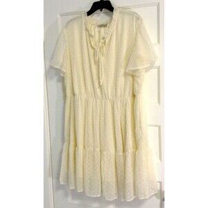 Vintage Y2K Nemidor Butter Yellow Sheer Feminine Romantic Cottagecore Fairy Peasant Prairie Boho Hippie Babydoll Beach Travel Vacation Coastal Embroidered Short Sleeve Lined Tiered Midi Dress with Front Neck Tie