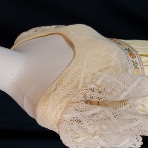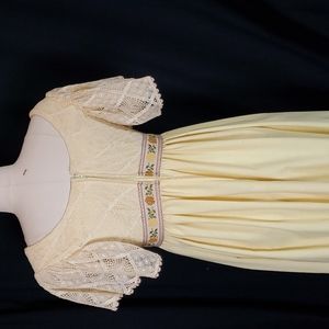 Vintage Couriers of California 60s/70s era maxi dress. Dress is tagged 7/8--fits my size 4 dress form (chest 34") perfectly. Fabric is a slubbed heavy-ish linen-look fabric with cream lace sleeves & bodice, lace insert in skirt, and floral braid below bust, empire waist, zip back. Perfect for a retro look for Prom, wedding, garden party or use for Edwardian costume cosplay.