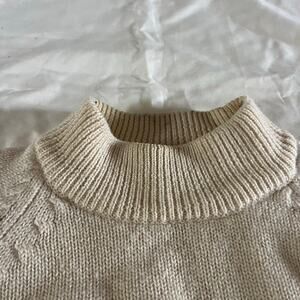Please note some discoloration around the neck and some loose threads. Loose knit in the armpit has created a bit of a space. Not exactly a hole. Sold as is.