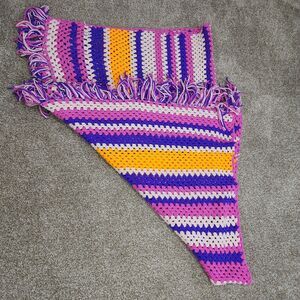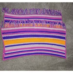 Vintage 1970's Pink Purple Gold Cream Striped 4 foot by 6 foot throw blanket with Fringe on edges perfect for twin sized bed in Girls room or back of couch sofa. Handmade and Wool blend, has some picks and pilling consistent with pre-owned afghans. Estimated to be 1970's, ready to be loved. Clean, smoke-free, pet-free