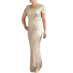 Vtg Crochet Lace Fringe Hem Champagne Gown Metallic Thread Size 10 FITS LIKE 4/6