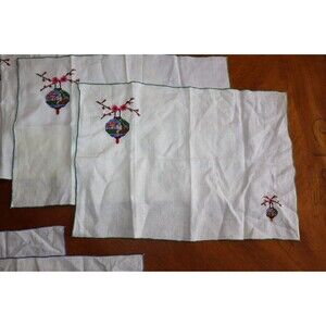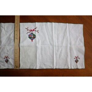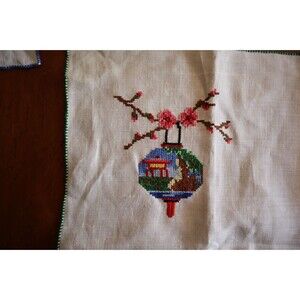 Vtg Cross Stitch Placemats Or Napkins Japanese Cherry Blossom Building 18x12"