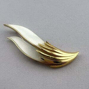 Vintage Modernist swirl Leaf design 3D Sculptural with the gold tone metal pieces on top of the white enamel piece