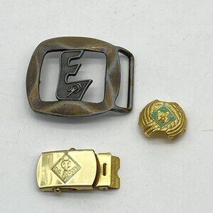 This vintage lot of 3 items from the Cub Scouts and Boy Scouts of America feature a bear neckerchief slide, a brass belt buckle and an Explorer E Belt Buckle. All 3 items are a great addition to any collection of historical memorabilia related to fraternal organizations, specifically the Boy Scouts. The neckerchief slide features a charming bear design and both items were made in the United States. The organization aspect of this item is related to the Boy Scouts, a group that promotes character development, citizenship, and personal fitness for young people. The year of production and signature are both unknown, adding to the intrigue and mystery of this collectible set.