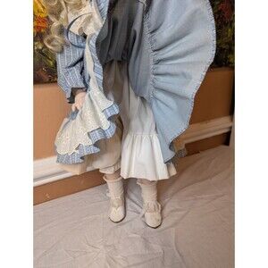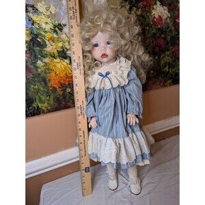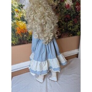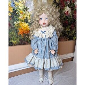 The product is a vintage custom Dianna Effner Ultimate Collection Hilary Porcelain Doll from 1987. This limited edition collector's item features a blonde curly-haired girl doll named Hillary, handcrafted by the artist Dianna Effner. The doll is signed by the artist and comes with removable clothes. Made of porcelain, this 24-inch doll is part of The Ultimate Collection franchise and has a light complexion with blue eyes. Perfect for all occasions, this handmade doll is a unique piece for collectors from the 1980s era.