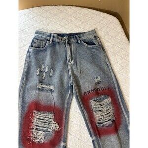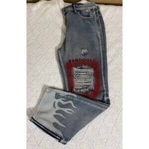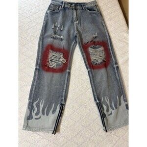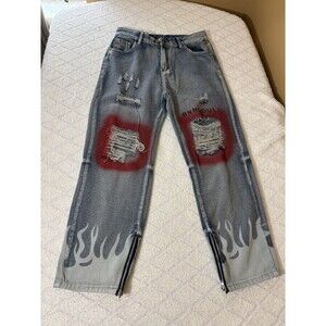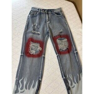 Vtg Custom Women’s Jeans Flames Design Red Paint Distressed 1/4 Zip See Details