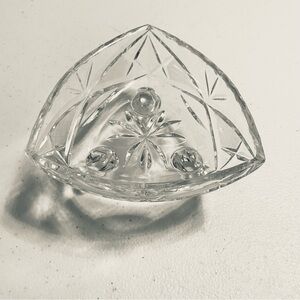 vintage trinket dish, crystal glass bowl, cut glass dish, footed jewelry holder, starburst glass, retro home décor, mid-century modern glassware, pressed glass collectible, small candy dish, clear crystal décor, triangular glass bowl