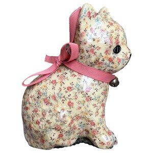 Vtg DECOUPAGE Ceramic CAT Kitten Kitty Floral Cream Fabric Pink Ribbon Bell 6" T