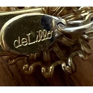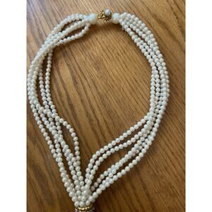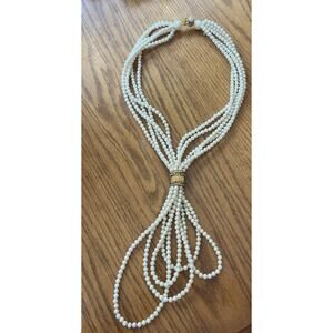 Vtg DELILLO Long Necklace Multi Strand Faux Pearl Beads String Knotted Signed Gold Deco piece with rhinestones wired circling. Beautiful gold tone push in clasp with a faux pearl center. 20” long. Five strands of faux pearls.