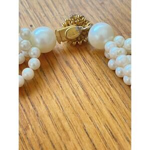 Condition is beautiful. Faux pearls are in very nice condition. Threaded strands are strong. I do not see any flaking. Gold tone nice condition no color loss all rhinestones on the wire wrapping around the gold tone piece. The only flaw. I see is a little bit of gold tone missing on the back of the clasp.