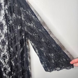 Vintage DELTA BURKE Sheer Black Lace Duster Cardigan. Estimated to be a size 1X. Open Robe/ Whimsygoth. Witchy. MISSING SIZE/MATERIAL TAG. Estimated to be a size 1X based on measurements (see in description). Also missing single button for closure (loop remains). Can wear open or add your own!