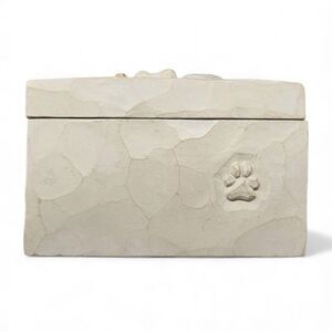 * Cream square box with lid: Carving of seated figure in cream dress, playing with yellow dog on lid of box