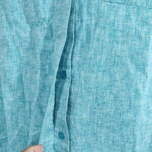 Vintage DG2 Diane Gilman Blue-Green Sleeveless Linen/Cotton Blend Button Up Top with Sheer Hi-Low Back and Hidden Buttons