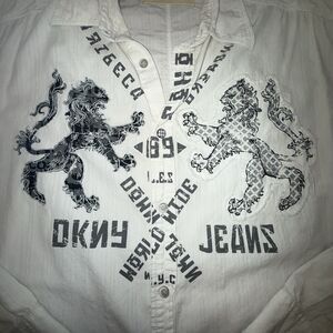 Vtg DKNY Jeans Y2K Graphic Button Up Shirt XL White Lion Crest Lions Mens