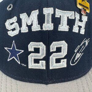 Vintage Team NFL AJD snapback baseball cap featuring Emmitt Smith #22 of the Dallas Cowboys. Classic blue crown with gray brim, embroidered graphics, and original pins. Made in USA, this collectible hat is perfect for football fans, retro sportswear collectors, and vintage streetwear lovers. Adjustable snapback fit ensures comfort and style.