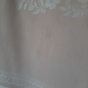 Charming vtg pastel pink tablecloth and six piece napkin set. Beautiful damask woven print perfect for your Easter dinner table or a Spring refresh. Tablecloth shows VERY minor wear i.e., a few pulled threads. No holes or tears.