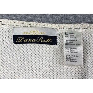 The product is a vintage Dana Scott floral embroidered beaded knit cardigan in women's size large. It features intricate floral embroidery and bead accents, making it a stylish and unique addition to any wardrobe. The off-white color adds a touch of elegance, while the knit fabric provides comfort and warmth. This cardigan is perfect for adding a feminine and vintage-inspired touch to any outfit.