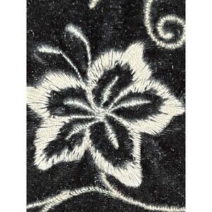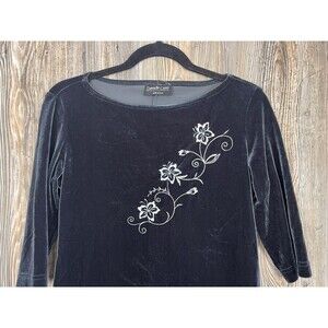 Vtg. Danielle Casey Dress S Black Velvet Midi Floral Embroidery Romantic Elegant. The size tags is missing, so my best guess is a size small. Please see photos for measurements. Also the material tag is missing, but the dress is stretchy so I believe it to be a polyester/spandex blend.