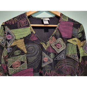 Vtg Dark Multicolor Artsy Geometric 3/4 Sleeve Stretchy Top Sz Lp Lauren Scott