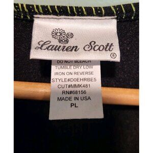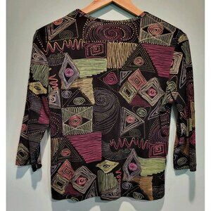 Vtg Lauren Scott Dark Multicolor Artsy Geometric 3/4 Sleeve Stretchy Top