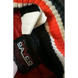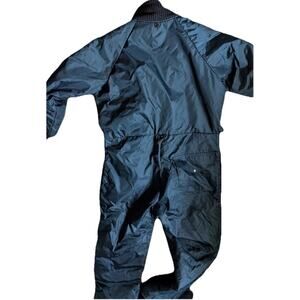 Authentic vintage DAVCO insulated coveralls — a durable, cold-weather jumpsuit with that classic ‘70s-‘80s racing stripe look. The navy nylon exterior contrasts sharply with a quilted red lining, giving it both warmth and standout retro style.