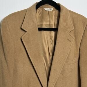 Classic vintage camel hair blazer in warm camel brown, made in USA with luxe 100% camel hair fabric, two-button front and tailored fit. Vintage Pre-owned- This blazer is in good vintage condition --minor wear consistent with age.. No rips, no tears, no stains. Refer to images for condition. Due to light and screen difference, the color may be slightly different from the picture.