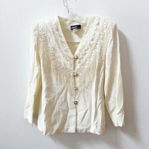Vtg Dawn Joy 80s Womens Ivory Western Fringe Blazer Skirt Suit Set 1980s Dynasty soap opera vibes Power suit