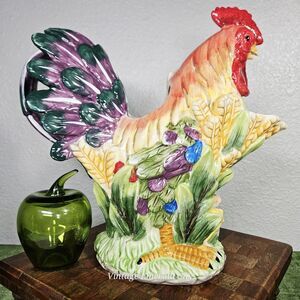 Charming vintage 1980s ceramic rooster pitcher, beautifully hand-painted with vibrant details in a 3D design. Functional as a water jug or simply as colorful farmhouse kitchen décor. Excellent collectible for rooster and bird lovers.