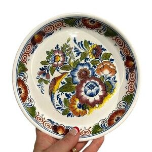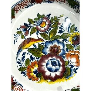 This vintage Delft collector plate features a colorful hand-painted bird and flowers design, with a round shape and a diameter of 7.5 inches. The plate showcases a peacock character and is made of ceramic material, produced using the Delft technique in the Netherlands. The plate is perfect for all occasions and is a great addition to any decorative collection.