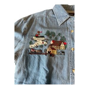 Stylish denim shirt featuring a charming embroidered village scene. Perfect for casual wear.