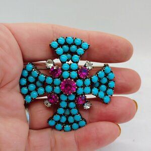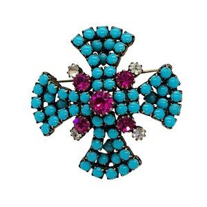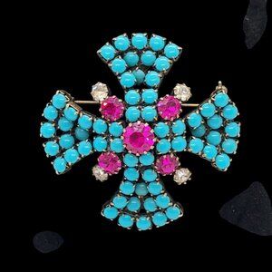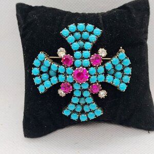 Vtg Designer Maltese Cross Brooch Gold Faux Turquoise Pink & Clear Rhinestones