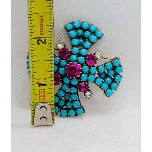 Make a bold statement with this vintage Maltese Cross brooch. Gold tone with faux turquoise, purple, and clear rhinestones. Perfect for adding a touch of elegance to any outfit.