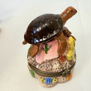 The Vtg Direct Connections Co. Sea Turtles Hinged Trinket Box is a charming and unique decorative collectible featuring a sea turtle design. Made of porcelain/ceramic with a glossy finish, this trinket box has a metal clasp closure and measures 3 inches in height and 2.25 inches in width. The green color and turtle character make it a perfect surprise gift for any turtle lover or collector of porcelain hinged boxes.