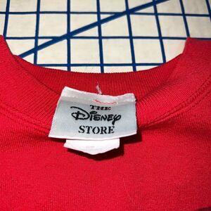 This vintage Disney sweatshirt features a 101 Dalmatians design in red with embroidered and logo accents. It is a cropped style with a solid pattern, long sleeves, and a crew neck. Made of cotton fleece material, it has a regular fit in size Large. The sweatshirt has a nostalgic 90s theme and is perfect for casual wear or activities like walking, running, or jogging.