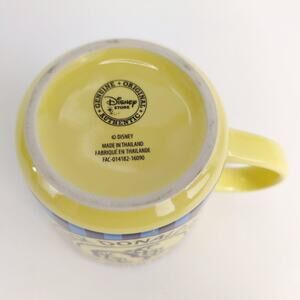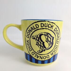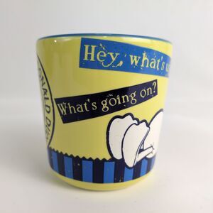 This large blue & yellow ceramic coffee mug from the Disney Store features a chill Donald Duck saying "Hey, what's up? What's going on?". The mug holds approx 12oz, Dishwasher and Microwave safe. Early Y2K era.