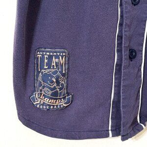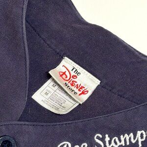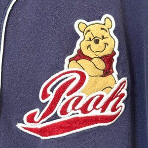 Vintage Disney Store Winnie the Pooh "Bee Stompers" navy blue cotton baseball jersey with button down front closure and embroidered patch details.